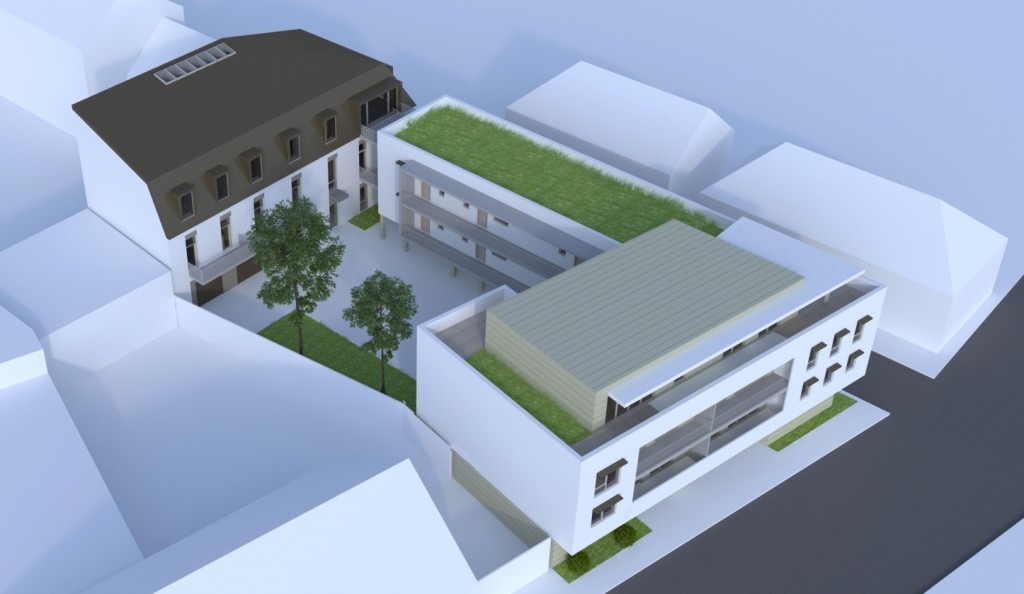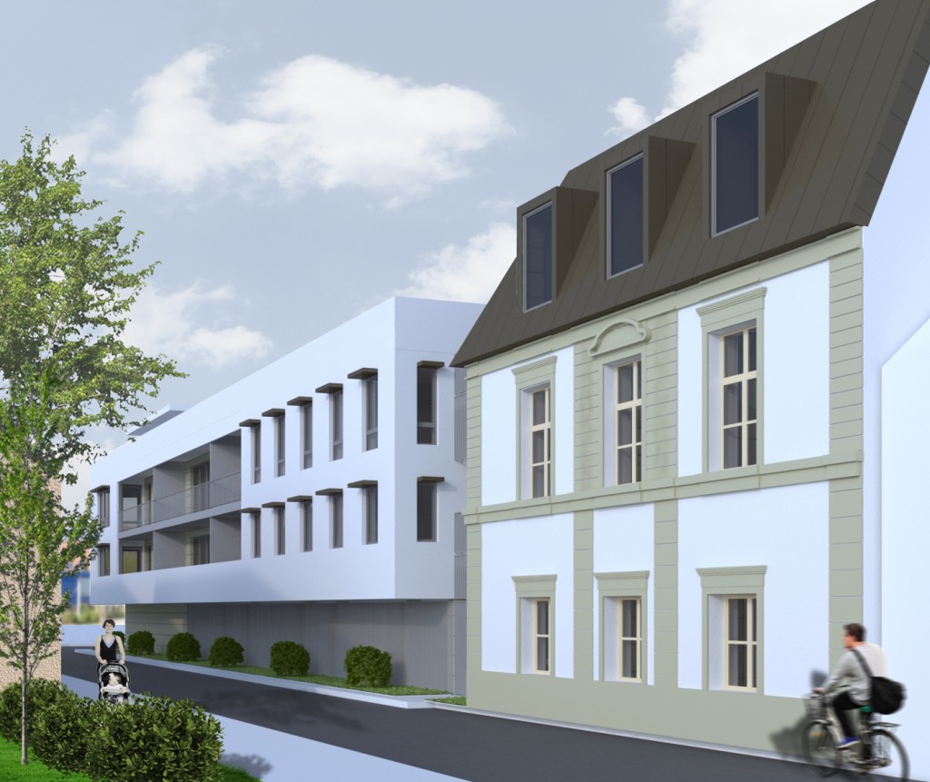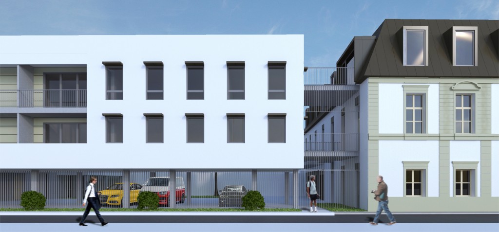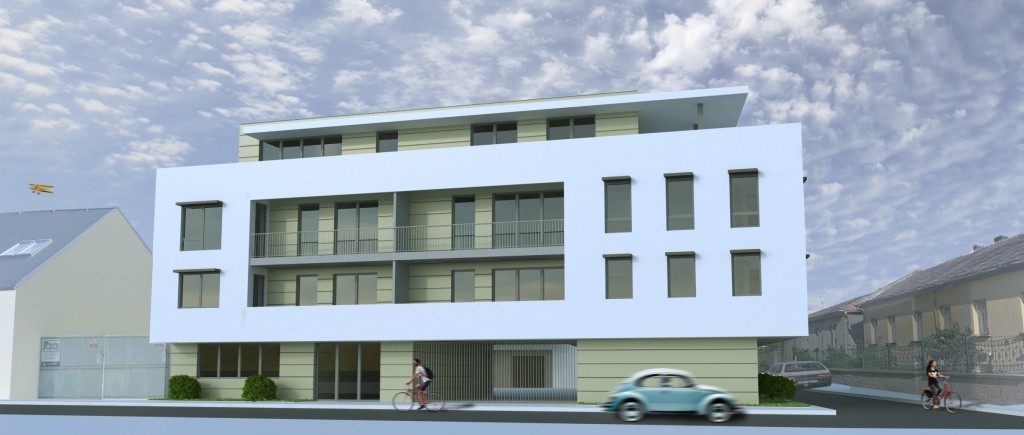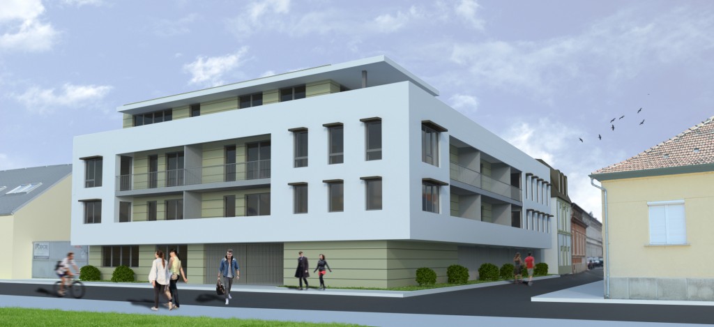 25 lakásos társasház, Győr-Sziget városrészben. A tervezett épület egy új épületrészből, és egy átalakított műemlék jellegű szárnyból áll.